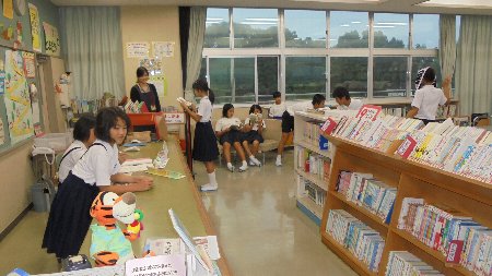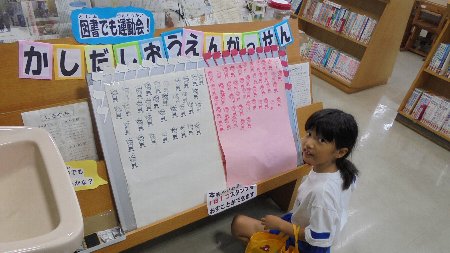 図書室では「貸し出し運動会」が続いています。ひとつ、ふたつ、みっつ・・・どちらが勝っているのでしょう。そういえば玄関でも「しせい運動会」の勝負がまだついていません。