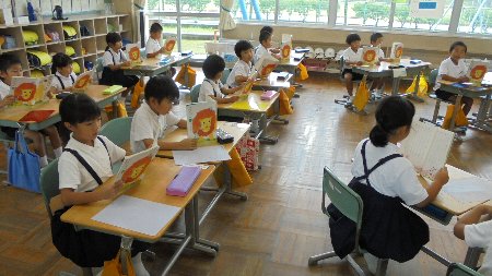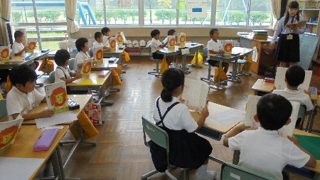 久しぶりの1年生の授業写真です。入学以来国語の時間だけでなく家でもたくさん練習して「本読み」がたいへん上達しました。みんなで声をそろえて読むのも上手です。おや、担任の先生の手に楽器が見えます・・・これが上達の秘訣ですね。