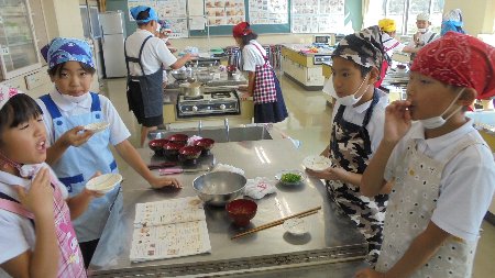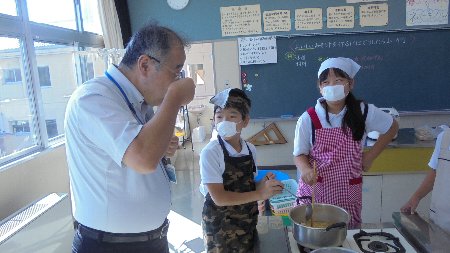 5年生が家庭科で味噌汁を作りました。もちろん使った「みそ」は一昨年自分たちがしこんだみそです。煮干しでだしを取り味がちょうど良くなるよう少しずつ味噌を溶かしていきました。途中勉強を見に来て下さった大学の先生が通りかかったので味見をしてもらいました。味は・・・もちろん自分たちで作った世界に一つだけの味噌汁の味はばっちりでした。