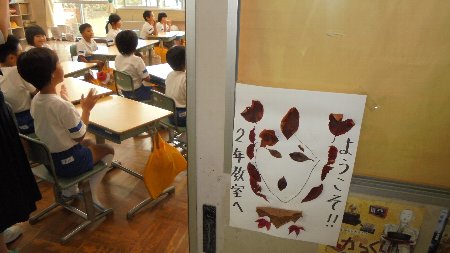 教室の入り口にこんな看板が・・・すっかり秋を感じさせる掲示です。今週は遠足があります。今日は雨模様でしたが水曜日は秋晴れになるとよいですね。