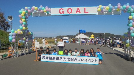 大海小学校のすぐ横を走っている「河北縦貫道」がもうすぐ全線完成します。それを記念して新しい道路を走ってみようというロードレースがありました。