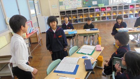 今日は4の段を猛練習、二人組になって交互に九九を言い合っていく練習の仕方をしていました。みんなつまらず速く言えてびっくり。この休みには、ご家庭でこのやり方で家族と練習してみると良いですね。
