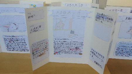 5年生が国語の学習で立派なリーフレット(ショーウィンドー)を完成させました。椋鳩十さんの「大造じいさんとガン」を授業で学習し、それと並行して他の作品を読みまとめました。どのリーフレットも読みがいがあります。挿絵もきれいに仕上がっています。