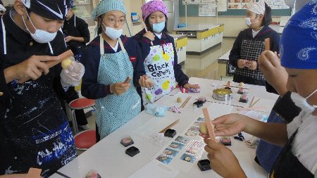 岡山県蛍明小学校と地域のことを教え合います。「地域の自慢」と銘打ってフルーツを交換をきっかけに交流をスタートします。先日送ってもらったメロンのお返しに大海小学校からは「紋平柿」を送ることに決めました。みんなで味を確認しました。メロンに負けないくらいおいしかったです。柿の一つ一つにメッセージのシールを貼り、手紙を添えて送ります。