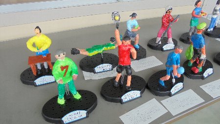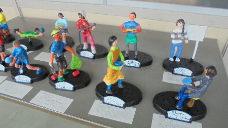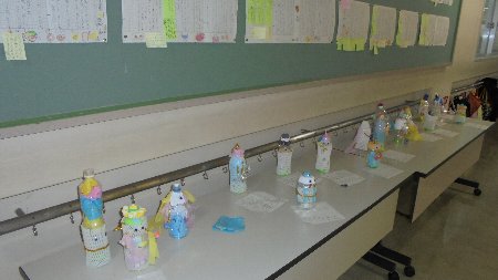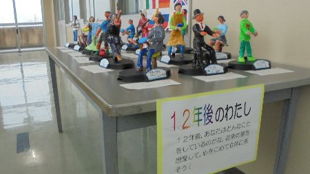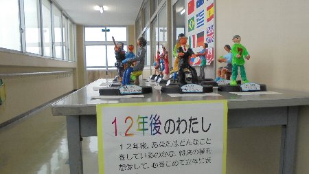ろうかの展示をまた紹介します。6年生の作品です。ちょっと面白いんですよ、それぞれのテーマが。一人ひとりの将来の夢、なりたい姿を形に表しました。なりたい職業を粘土で形作り、きれいに色を塗って仕上げました。写真からいくつかわかるでしょうか。
