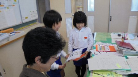 昨日の昼休み、職員室の教頭先生に上手になった九九を聞いてもらってシールをもらいました。クラスでは6,7,8の段に挑戦している人が多いそうです。3人の人が最後までいったそうです。これからの繰り返しが大切ですね。冬休み頑張りましょう。