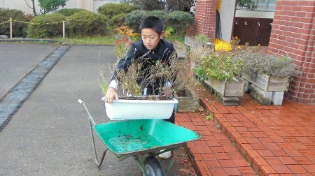 プランターの入れ替えを考えていたところ、早速6年生のNさんが手伝ってくれました。玄関の咲き終わったプランターを移動する仕事、一輪車を見事に操り運んでくれました。晴れ間を見て続きをします。また手伝って下さいね。