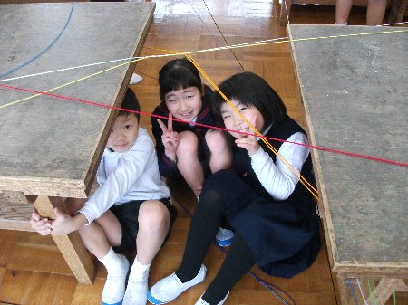 3年生が図工の学習でスパイダーマンになりました。図工室にクモの巣を張りめぐらせてその中で自由に動き回りました。おや、クモの巣に引っかかったかわいらしいチョウチョもいますね。(笑)クモの糸は色とりどりの毛糸を使っていました。冬休みお家でもはやるかもしれませんね。