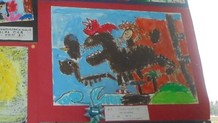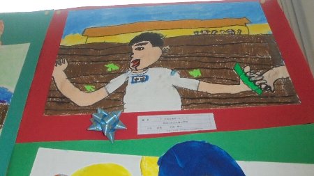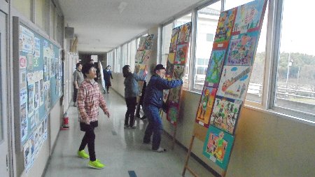 学校では、今日2階廊下に河北郡市図画展の作品が回ってきたので職員みんなで展示しました。来週、登校したらじっくり見てくださいね。1年生は米田さん、2年生は中田さんの絵が学校代表です。