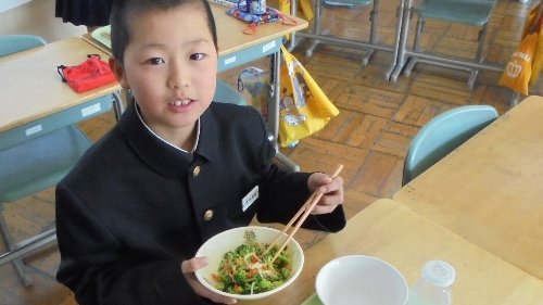 給食時間に4年生の教室をのぞきました。もう食べ終えて後片付けしてしている中にさらにもりもりともられた野菜を食べているTさん、おかわりして教室として完食する、素晴らしいですね。後ろでは人気の蜂蜜カステラをめぐってじゃんけんバトルが(笑)
