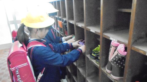 体だけでなく、心も育っていますね。もう一枚の写真は登校時の玄関での一コマです。いつも整然と靴のかかとがそろっているのは、こうやって丁寧に下駄箱に並べているのですね。自分のものだけでなく、他にかたがっていたら直してくれているのですね。