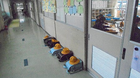先日行われた委員会活動の時、廊下を通るとご覧かの通り。すばらしい。委員会のメンバーのランドセルが整然と並べられています。どの会場でも・・・これならさぞかし教室の中では学校生活がより良いものになるためにさかんに話し合いが行われているのでしょうね。
