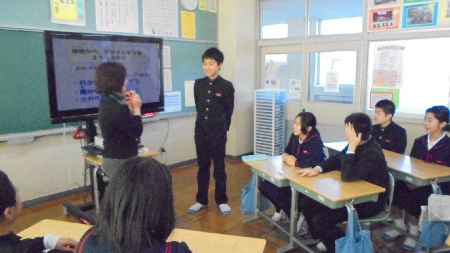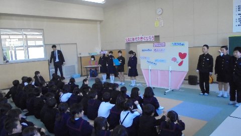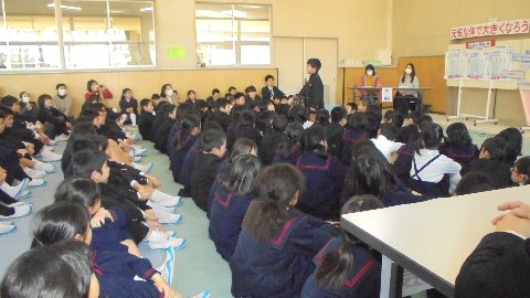 看護大の曽根先生をお迎えして、将来にわたって危険で違法な「薬物」を使うことが無いよう学習しました。途中担任の赤池先生が薬をすすめる悪者の役、子どもたちがその誘惑をことわる役でミニ芝居をしました。しっかりと断ることができていました。