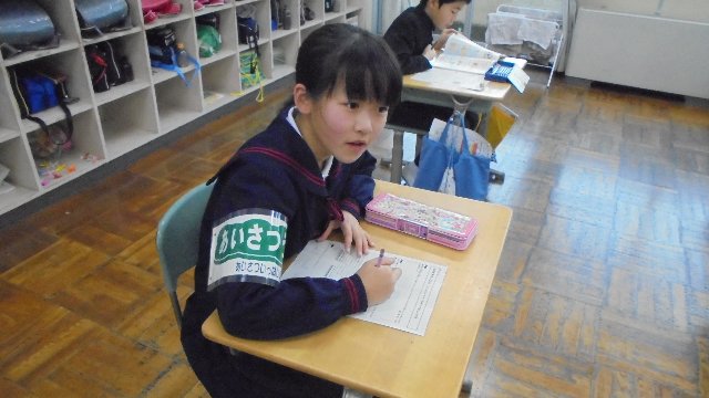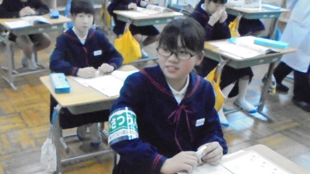 毎朝のあいさつ運動、腕章を使うことにしました。5年生の教室をのぞくと朝の会でも着用していました。気に入ったんだね。
