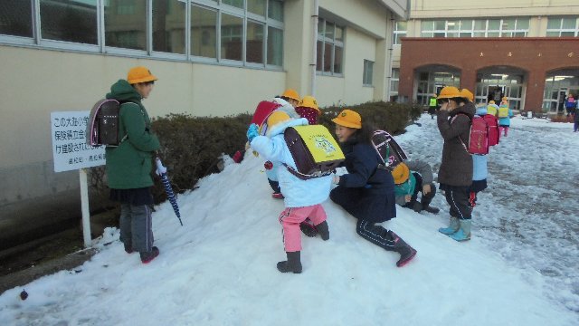寒さが少し緩んだので、学校では屋根雪に注意するよう指導しています。大きな屋根からの落雪は大人でもヒャッとします。