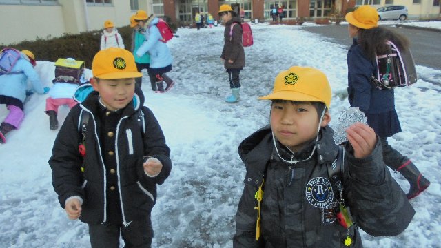 良い天気が続き、その分朝の冷え込みがはげしくなっています。学校の池は、まだ厚い氷が張っています。毎朝登校した子ども達が氷上に雪の溶け残った塊をすべらしています。まるでカーリングです。