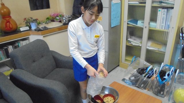 学校では、豆まきをしています。というよりは食べています。その豆はもちろん3年生が作った大豆です。他の学年にもおすそ分け。