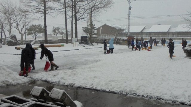 学校は、みんながいつ登校してもだいじょうぶなように玄関がきれいに雪すかししてあります。地域の方と先生が協力しています。