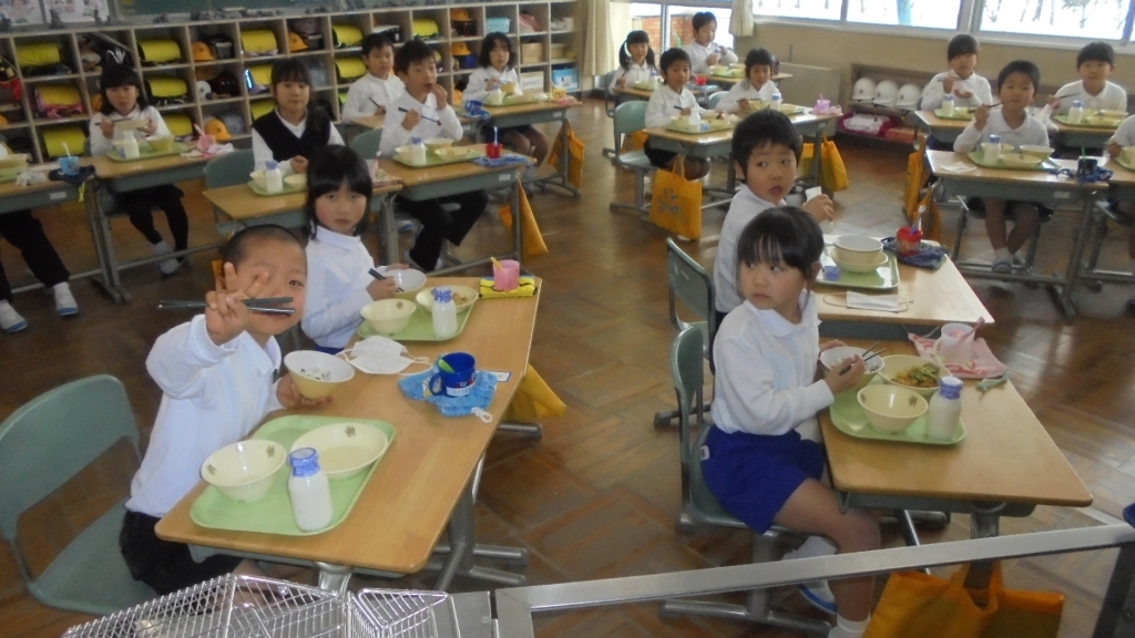 1年生が給食の準備をしています。この1年で、早く配膳準備ができるようになりました。食べるのも速くなったね、そして食欲も(笑)