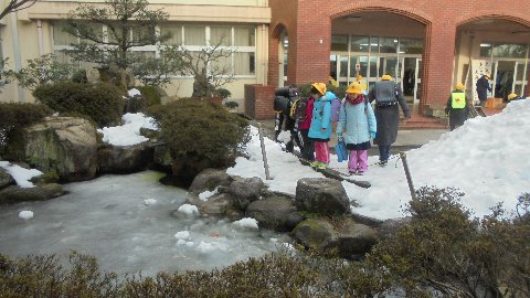 良い天気が続き、その分朝の冷え込みがはげしくなっています。学校の池は、まだ厚い氷が張っています。毎朝登校した子ども達が氷上に雪の溶け残った塊をすべらしています。まるでカーリングです。