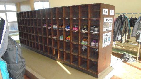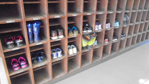 先週まで長靴がずらりと並んでいました。今週はご覧の通り運動シューズに変わりました。こんなところにも春の訪れを感じさせます。