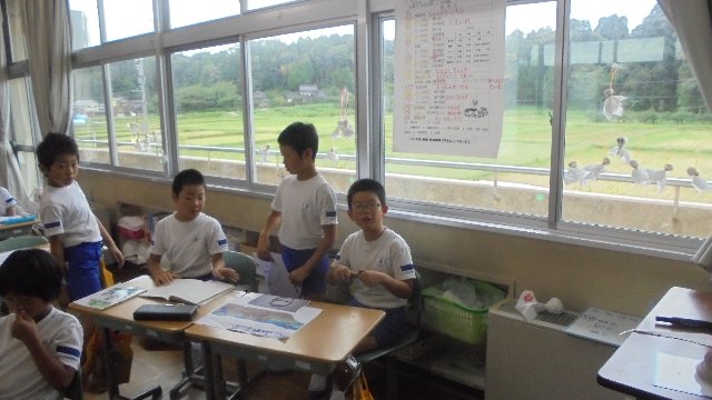 今週4年生がふるさと環境学習として大海川へ出かけました。水生生物について調べてきました。各自が工夫したペットボトルで作った携帯水槽?を持って行きました。帰りには、その中に魚の赤ちゃんやエビ・・・いろいろな生き物を採取してきました。また、紹介しますね。帰ったら早速インターネットで名前を調べていました。