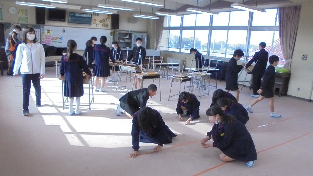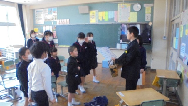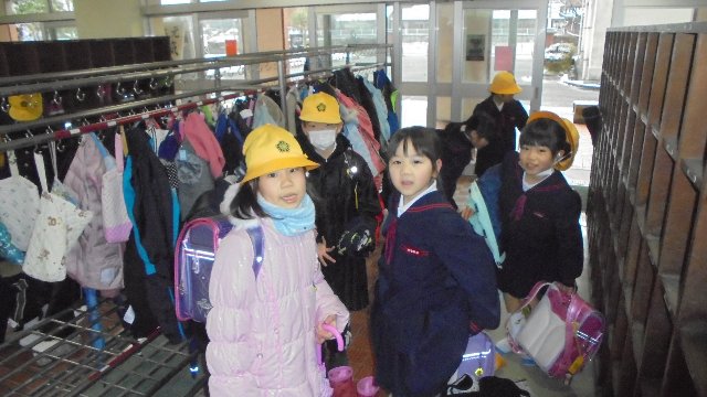 ベランダから黒ずくめの不審者が・・・ただちに2学年ごと安全な施錠できる部屋へ避難。みんな落ち着いて訓練に参加できました。春休み一人で留守番することもあるかもしれません、お家でも訓練。
