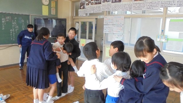 玄関で体育館で…どこでも元気な2年生です。体育担当は新任の髙﨑先生です。