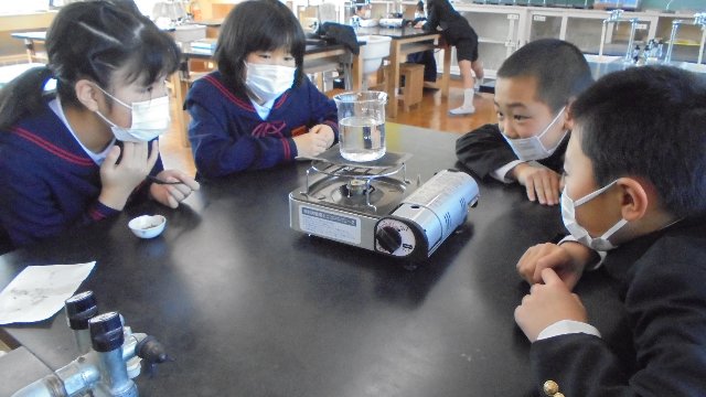 ものの温まり方では、ビーカーの中におがくずを入れて対流の起こっている様子を観察します。4年生は大海味噌を仕上げた経験を生かし、ビーカーに大海味噌を入れて観察しました。いいにおいがして、味噌汁が食べたくなったようです。