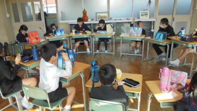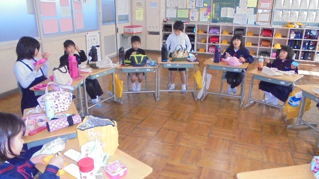 教室を回ってみると、どの教室にもお弁当が並べてありました。ランチの後は、なかよし班で遊びます。