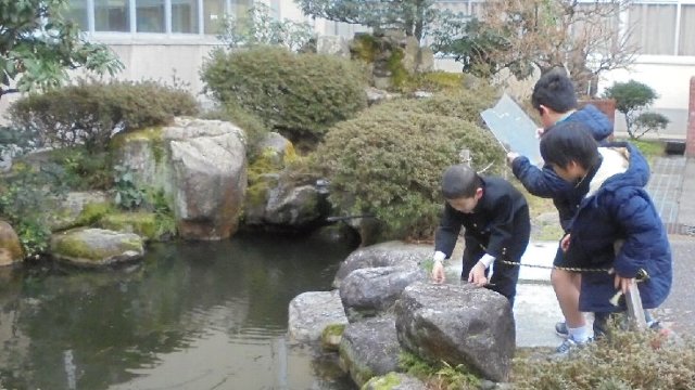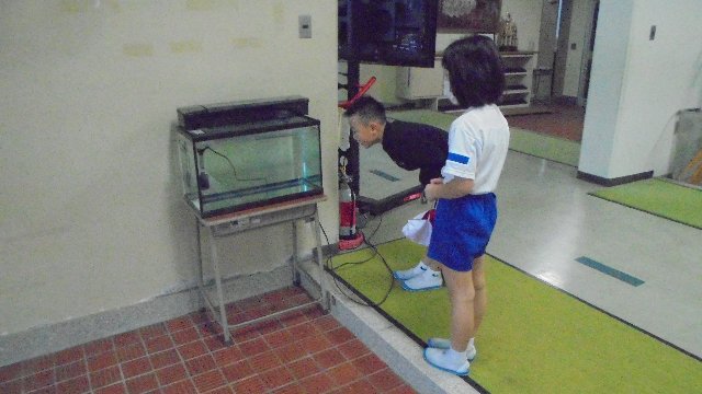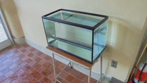 ヤマメをみんなで観察できる用意ができました。この新しい水槽は、コミュニティスクールの予算で購入しました。低学年はなんでまだ魚がいないのか興味津々。