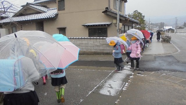 朝の登校時、少し吹雪きました。宝達山は厚い雲に覆われて見えませんでした。そんな中でも防犯パトロールのみなさんと通学路の工事をしている方が見守ってくれます。工事関係の方からあいさつされました。「長い間、協力ありがとうございました。今日で工事が終わり、見守りも最後になります。」と。こちらこそ工事期間中8ヶ月にわたり長期間早朝から安全指導いただいて感謝します。ありがとうございました。