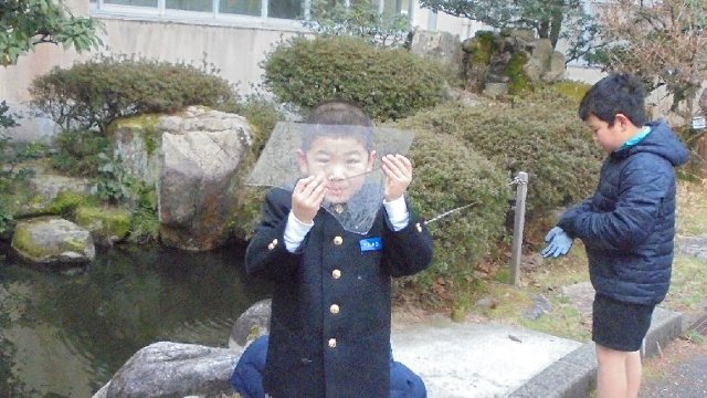 昨日は今期一番の冷え込み、今朝はそれ以上に寒かったようです。寒暖計は-3℃でした。昨日玄関前広場のすべりやすいところに融雪剤をまきました、子ども達は凍っていないので不思議そう、いや残念そうでした。(笑)