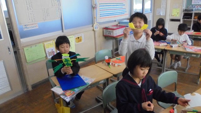 教室前廊下にいつもすてきな図工作品が並んでいる2年生。今回は楽しい楽器がいっぱい。おや、よく見るといっしょにひょうたんが並んでいるではないですか、思い思いに色づけしたんだね。