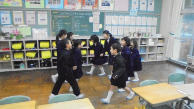 ベランダから黒ずくめの不審者が・・・ただちに2学年ごと安全な施錠できる部屋へ避難。みんな落ち着いて訓練に参加できました。春休み一人で留守番することもあるかもしれません、お家でも訓練。