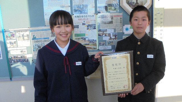 今年の大海小の代表は、6年生の出村さんです。当日清水育英会理事長城村さんが表彰伝達に来て下さいました。出村さんの立派な行い、他の範となる善行に拍手です。大海小学校の児童みんなも負けないくらい立派です。本当に学校代表です。