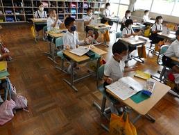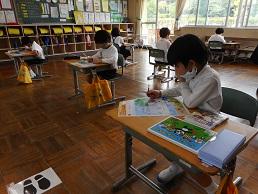 学校が再開され、グループやペアでの話し合い活動などはできませんが、落ち着いて学習や活動、掃除などに取り組み始めています。一年生も算数や国語の学習で頑張っています。