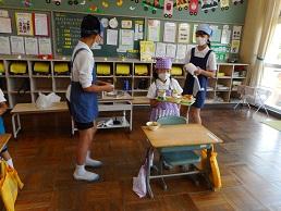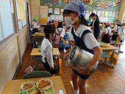 給食も、1年生は6年生に準備を手伝ってもらってとても上手にできています。どの学年もセルフ方式に慣れて、とても上手に配膳しています。