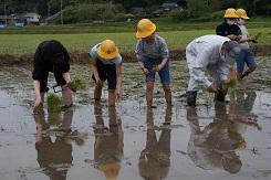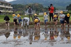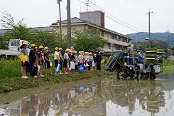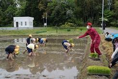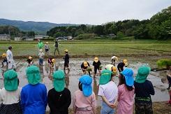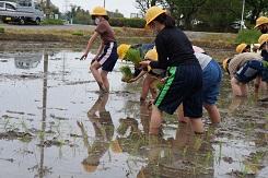 先日、教えていただきながら田んぼの代掻きをしましたが、今回も米作りの先生と地域や保護者の皆さんに田植えを教えていただきました。ぬかるむ田んぼに苦戦しながらも二時間かけて無事に苗を植えることができました。大海子ども園の子どもたちも応援に駆けつけてくれました。