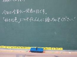 大海小学校では、「話す・聞く」力をつけるための活動を全校で行っています。今回の全員リレー発表のお題は「好きな色は・・・」でした。朝学習の時間に、好きな色とその理由などを順番に語っていました。いろいろな理由に「そうなんだ」とうなずく子もいました。子どもたちは、担任の先生にも好きな色についてお話してもらっていました。