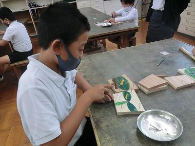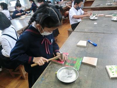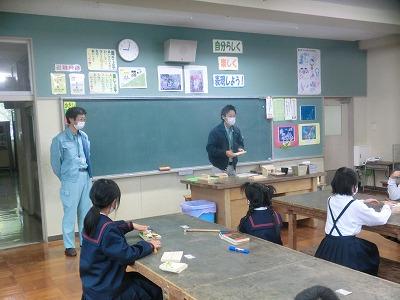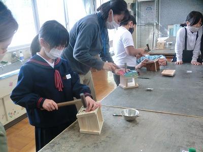 本日、学校公開三日目でした。1,2限目に4年生が金沢森林組合の方々の指導の下、ミニプランター作りをしました。事前にプランターの表面に絵をかいて、それを組み合わせて釘を打ちました。釘が曲がらないように注意しながら打っている様子が印象的でした。出来上がったプランターにクヌギの苗木を植えて、来年の春に学校林に移植します。