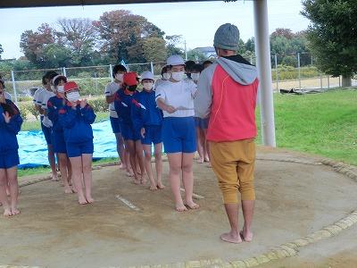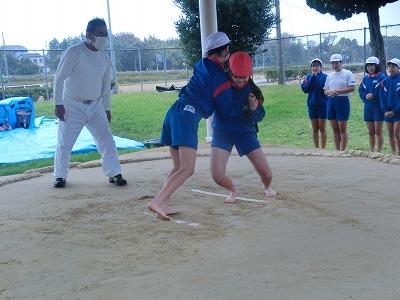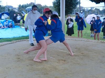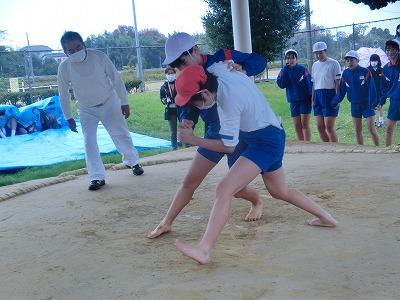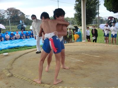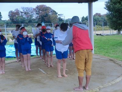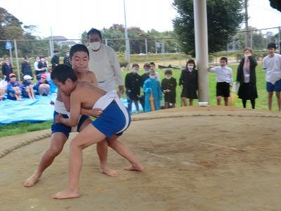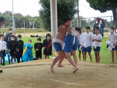 そして5,6限目には、6年生の相撲大会を実施しました。新型コロナの感染者が急拡大したことで、夏に行う予定だった相撲大会が中止となりました。しかし、6年生はこれで最後となるので、秋に延期できないかと時期を模索した結果、この学校公開の時期に行おうということになり、6年生だけの相撲大会を実施しました。子供たちは最初恥ずかしそうにしていましたが、1~3年生や保護者の声援を受け、力いっぱい相撲をとっていました。