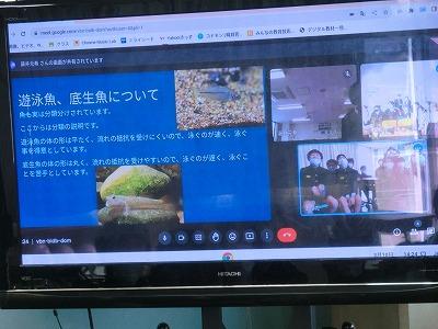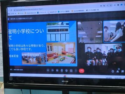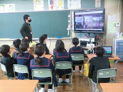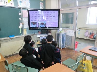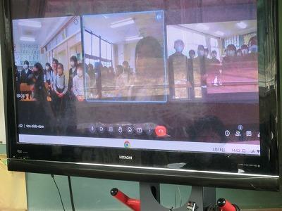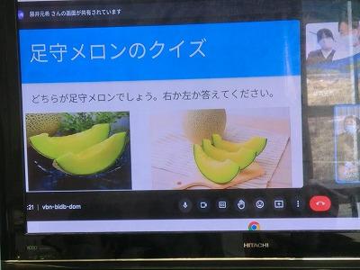 本日、3年生が岡山県岡山市立蛍明小学校の3年生とオンラインで交流しました。総合の時間に学習してきたお互いの地域の特産品などの自慢を発表し合いました。大海小からは、「紋平柿」と「大海みそ」について発表しました。お互いクイズ形式で調べたことを発表していたので、とても楽しそうでした。