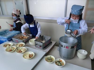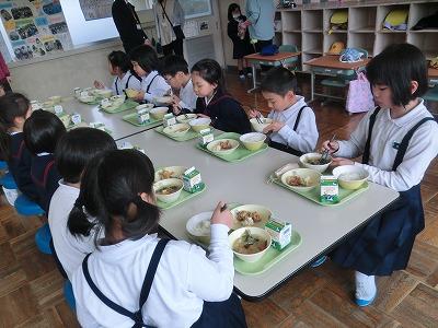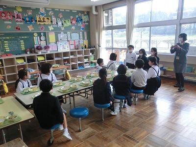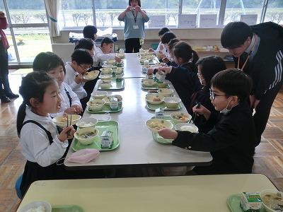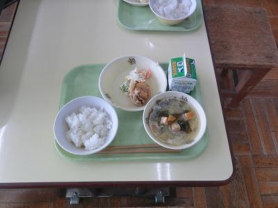今日から1年生も給食が始まりました。びっくりしたのは、最初の給食から1年生が配膳していました。先生の指示に従っててきぱき配膳している姿に頼もしさを感じました。1年生が3人ということで、2年生といっしょに仲良く1年教室で食べました。今日のメニューは、ごはん、鶏肉のレモンソースかけ、ポテトサラダ、キャベツの味噌汁、牛乳でした。たくさん食べて大きく成長してください。