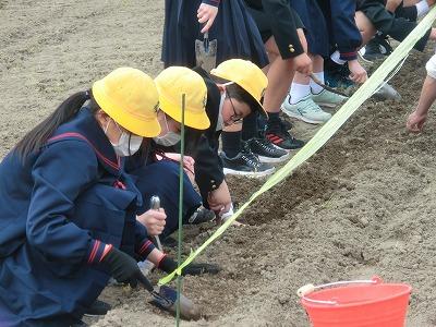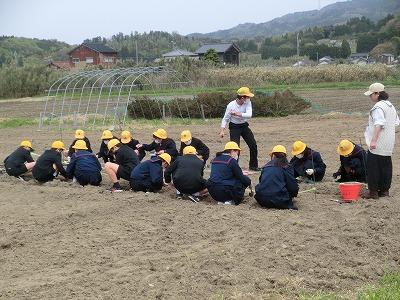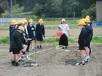 本日5限目に、6年生が学級園にジャガイモを植えました。理科の授業で使うのですが、地域の方にきれいに耕していただいたところに植えていきました。大きく育つことを願っています。