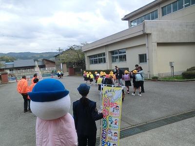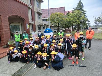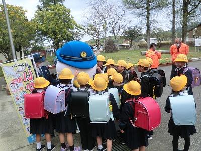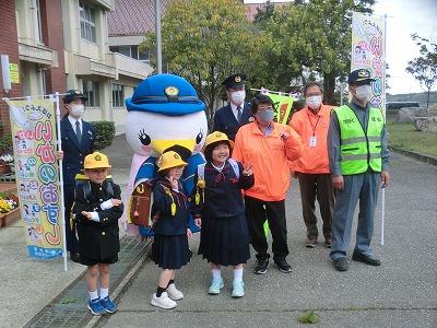 本日、1~3年児童の下校時に津幡警察署の方々と「しらとり係長」、防犯協会の方々などが来校して、交通安全や不審者に気を付けることなどを児童に伝えるために来校されました。子どもたちは「しらとり係長」を見つけると「かわいい」と言って握手したり、記念撮影をしたりしました。これからも安全に気を付けて、登下校してほしいと思いました。