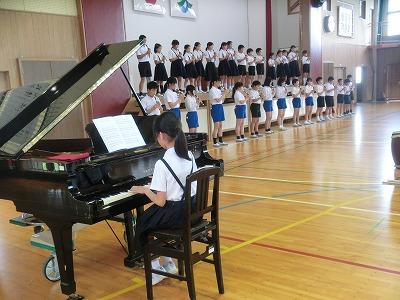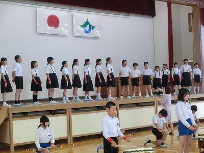 本日5限目にプール開きを行いました。午前中は雨も降り、できるか心配しましたが、お昼前辺りから日も射すようになり、無事、実施できました。5,6年生が水着に着替え、プールの安全を祈願してプールの四隅に酒と塩をまきました。その後、プールに子どもたちが入ると、一気にテンションが上がってきました。短時間しか入れませんでしたが、とても楽しそうでした。来週から他学年も入り、これからの体育授業は水泳になります。頑張って泳げるようになってください。
