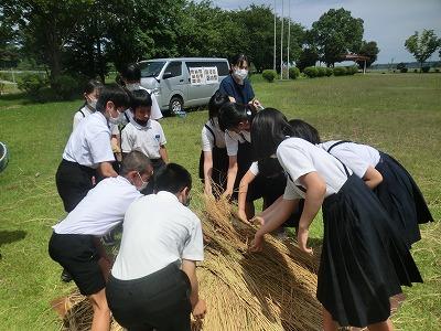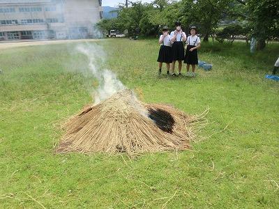 6年生は、先日の土器づくりの続きで、今回はいよいよ土器を焼いて完成させました。土器の上にわらをかぶせ、蒸し焼きになるようにわらに粘土を塗り固め、火をつけました。焼きあがるまでの時間を利用して、県埋蔵文化センターの出前講座を聞きました。縄文時代のお話と勾玉づくりでした。短時間でしたが、とても興味深い授業でした。