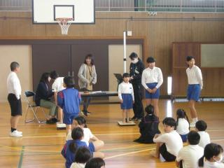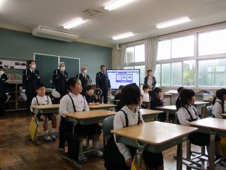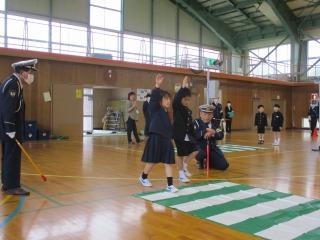 2限目に市の交通推進隊の皆さんから、道路を安全に歩くために大切なことを教えていただきました。お話を聞いた後、体育館で横断歩道の歩き方を練習しました。どの子もしっかりと安全に気をつけて横断歩道をわたることができました。
