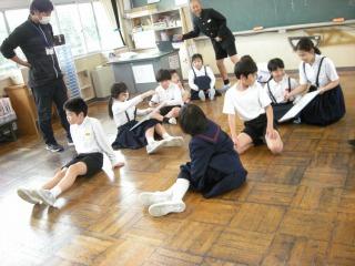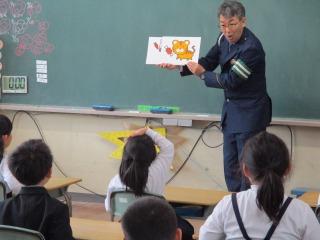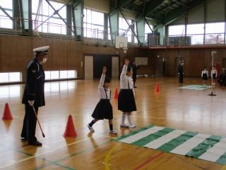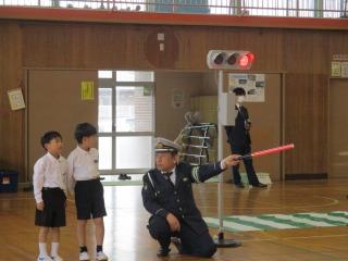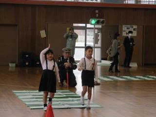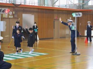2限目に市の交通推進隊の皆さんから、道路を安全に歩くために大切なことを教えていただきました。お話を聞いた後、体育館で横断歩道の歩き方を練習しました。どの子もしっかりと安全に気をつけて横断歩道をわたることができました。